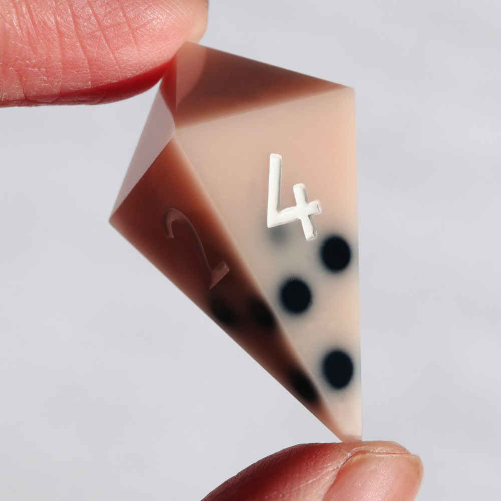 A cute and sweet milk tea boba-styled set, in classic milk tea flavor. Delicious! But sadly still inedible. Though the inclusions are on one side, the density is the same as resin and do not affect rolls for casual gameplay use.