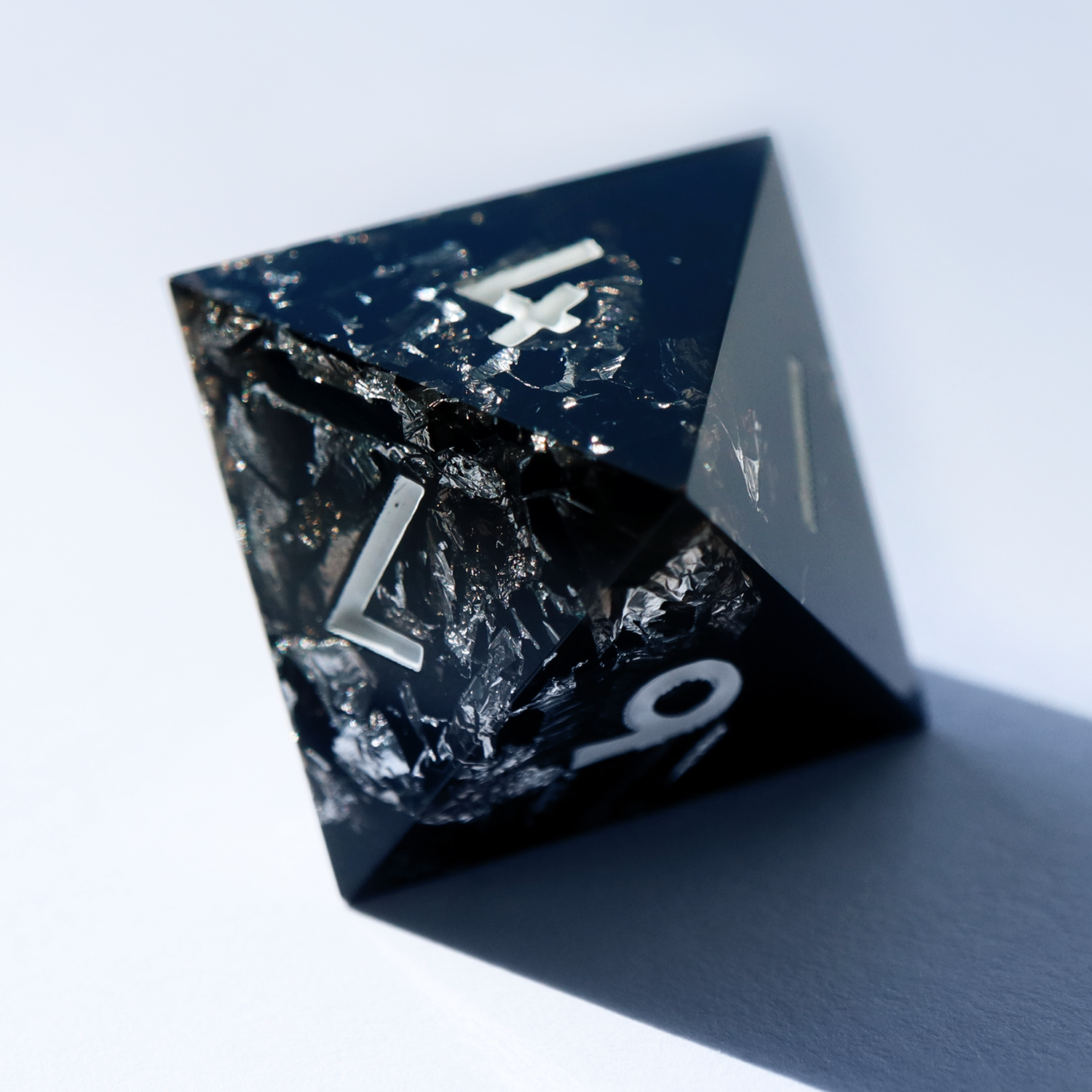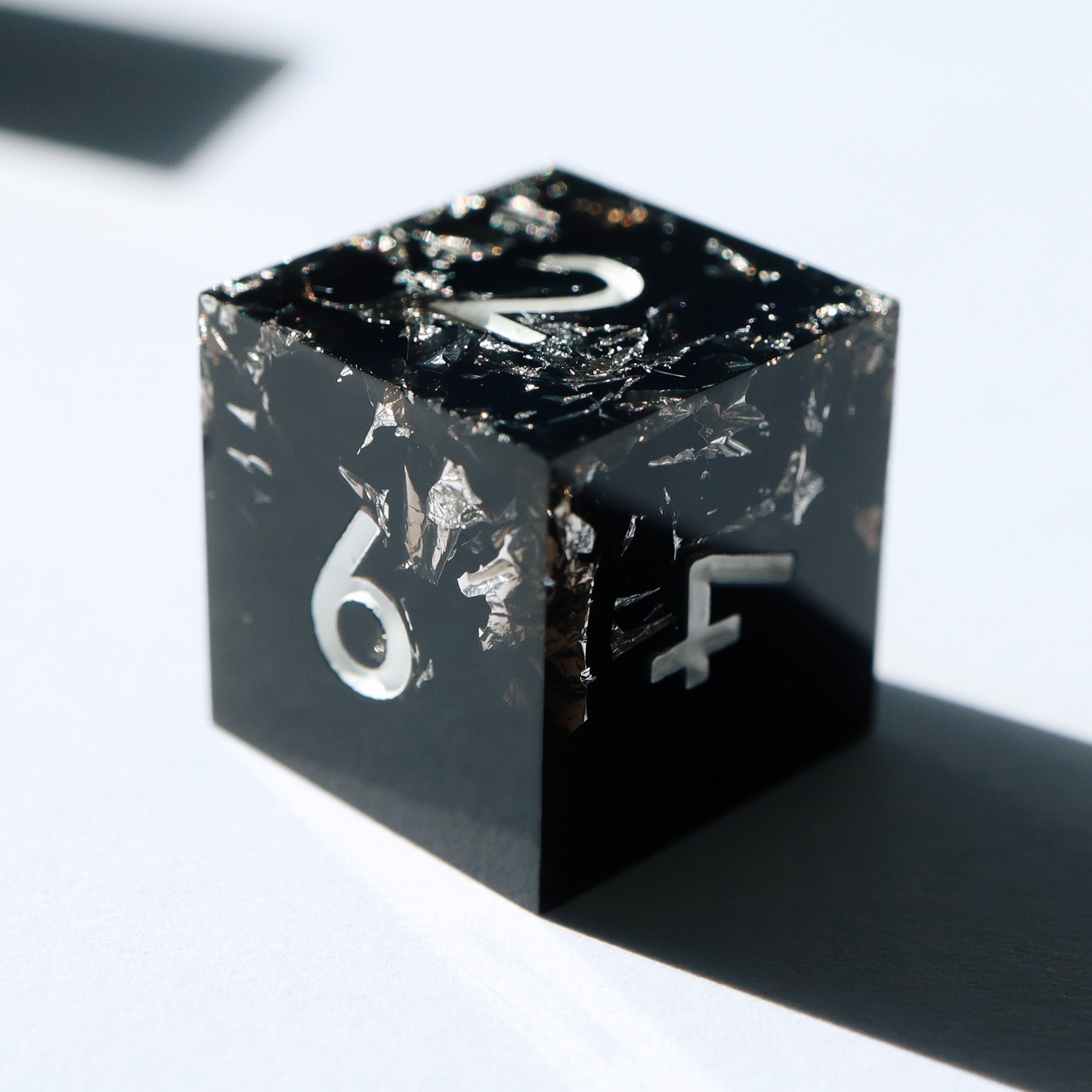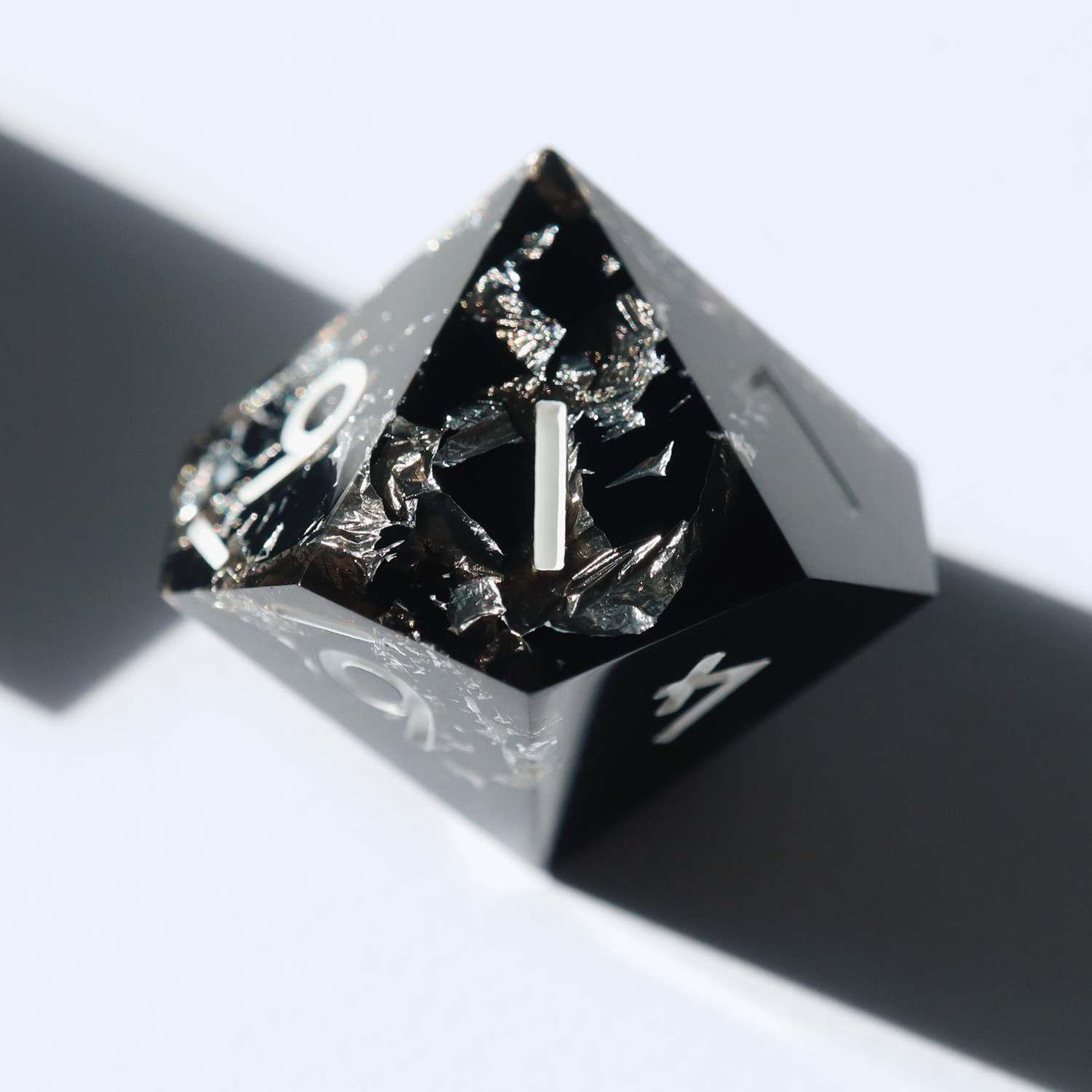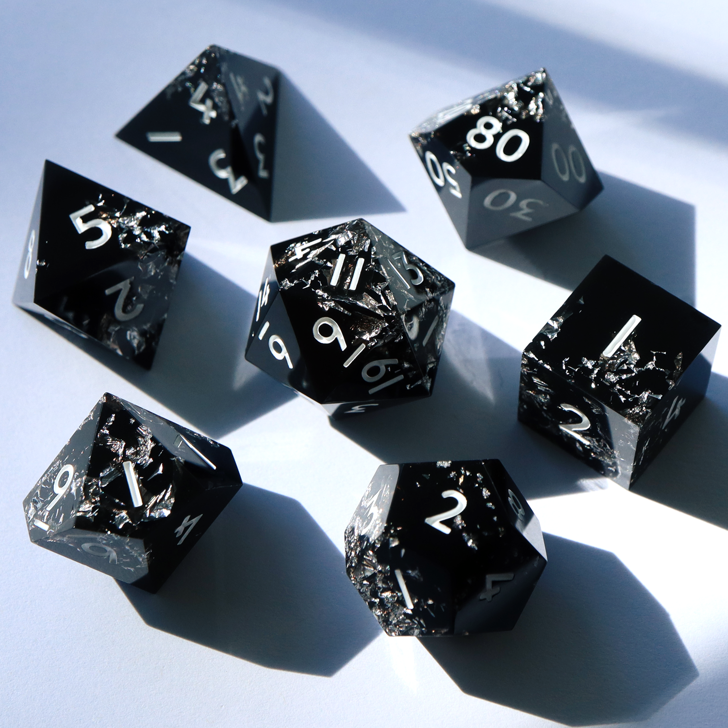 A minimalistic opaque black set half encased in silver foil, mimicking the texture of snow obsidian. This set includes one D4, D6, D8, D10, D%, D12, and D20.