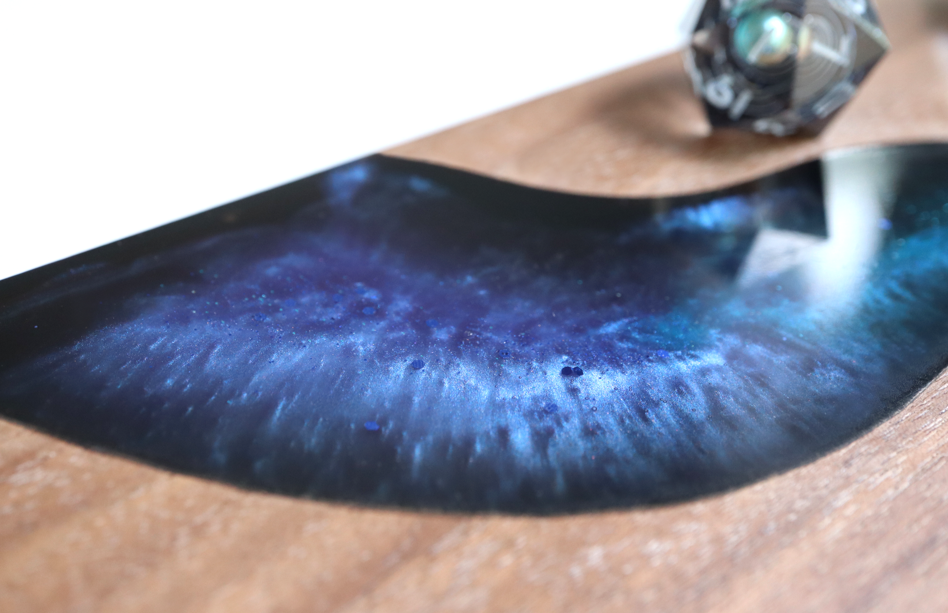 Our vaults are made with black walnut wood and hand-poured resin, with felt-lined interiors and magnetic closures. Both variants hold dice up to 25mm. The lid can be used as a rolling tray.