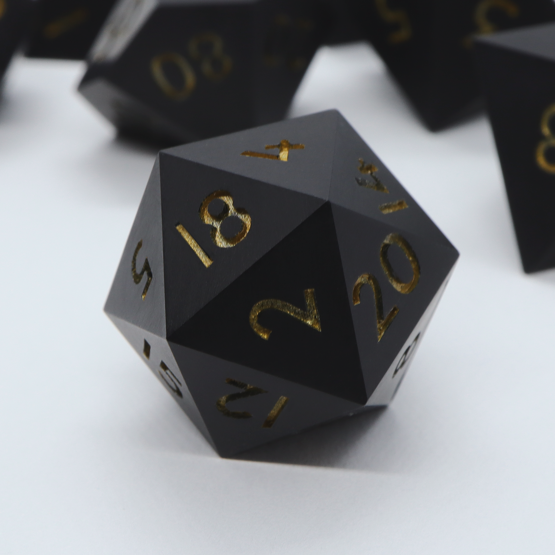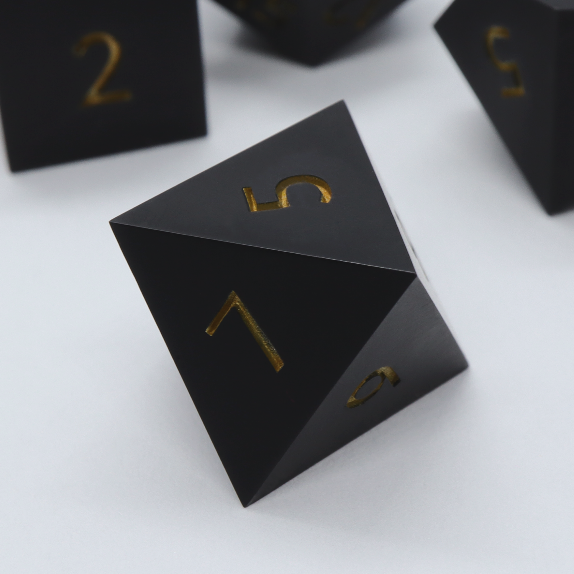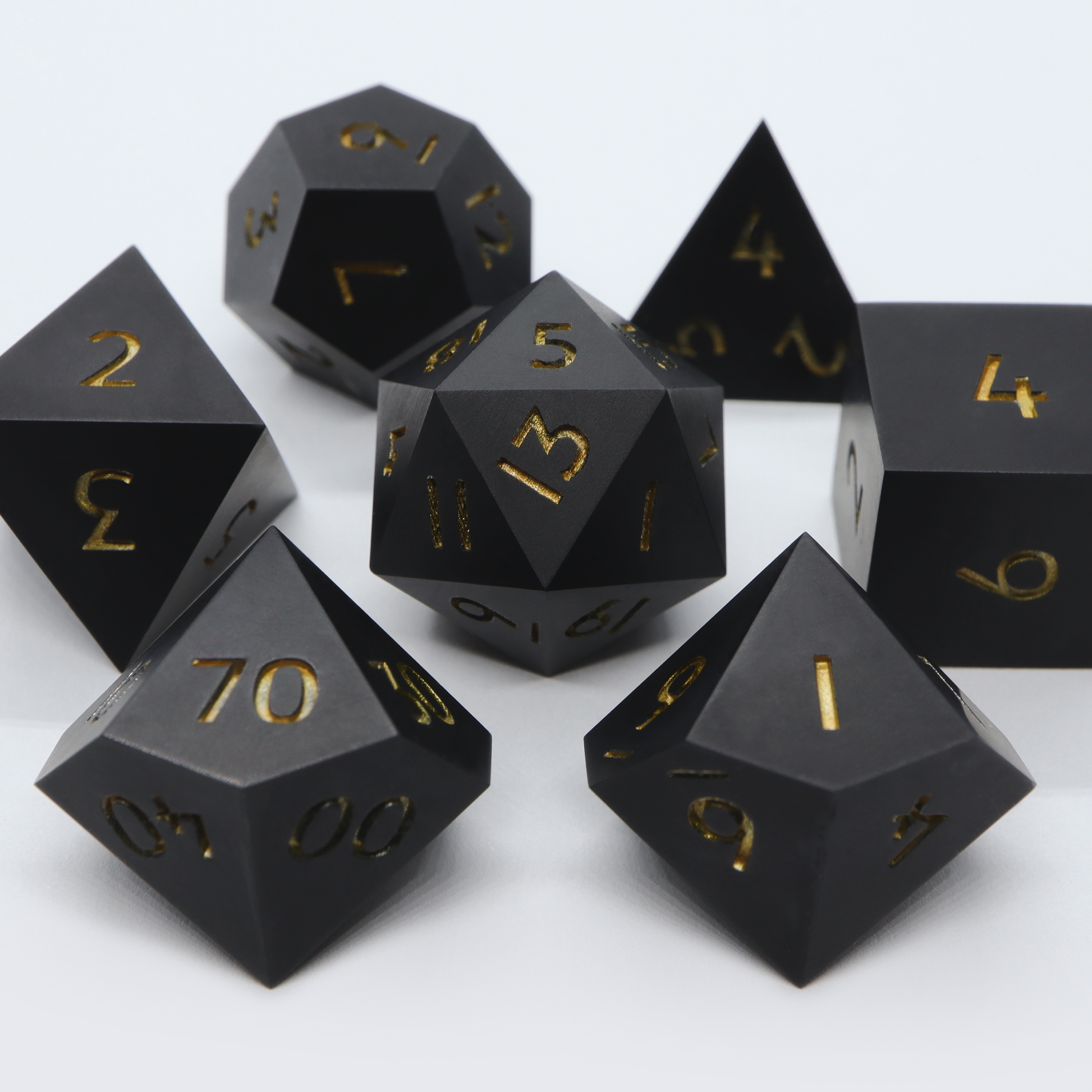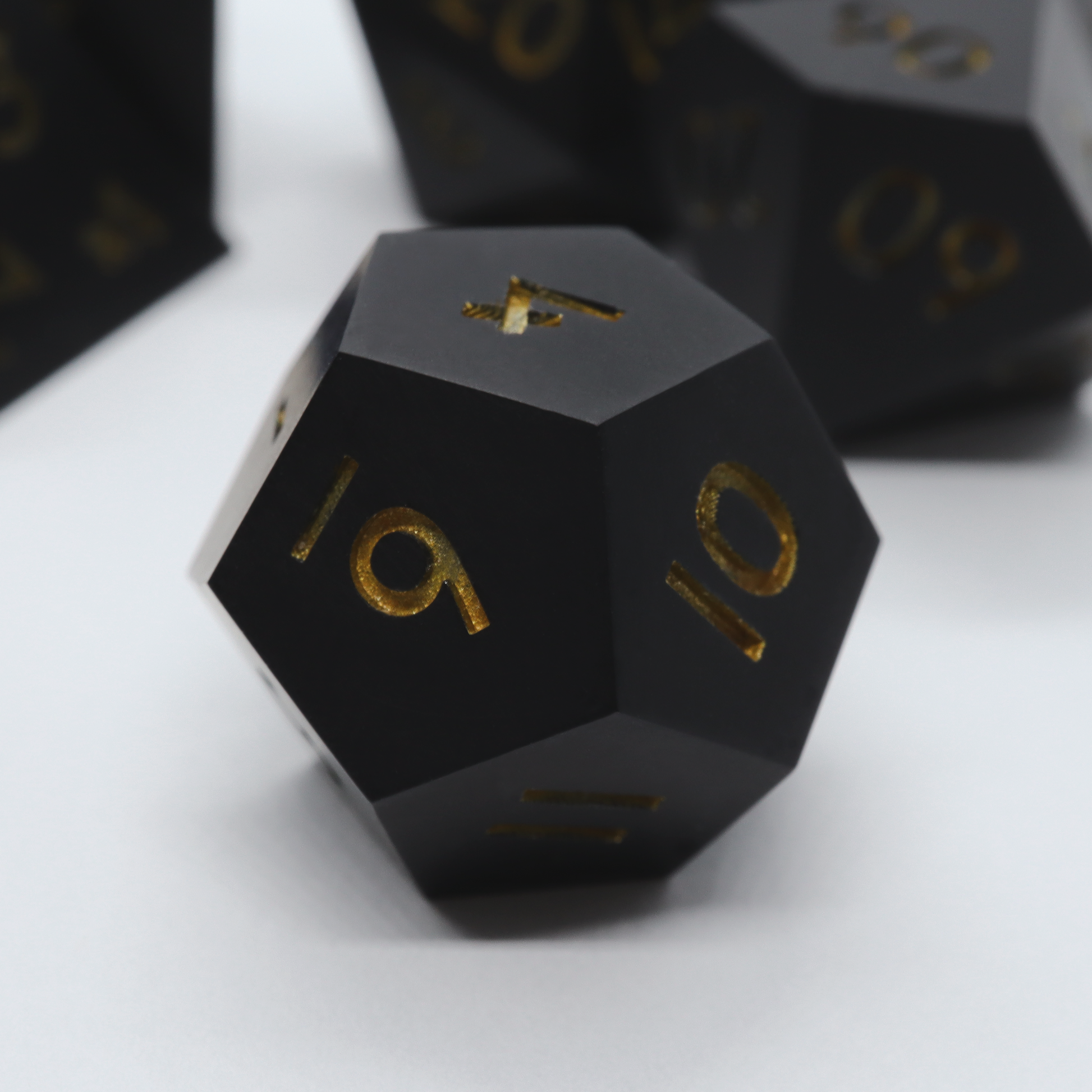 An ultra matte dice set in sleek and simple black with gold letters. The texture of this design is different from our usual sets - it is super smooth and velvet-like. This set includes one D4, D6, D8, D10, D%, D12, and D20.