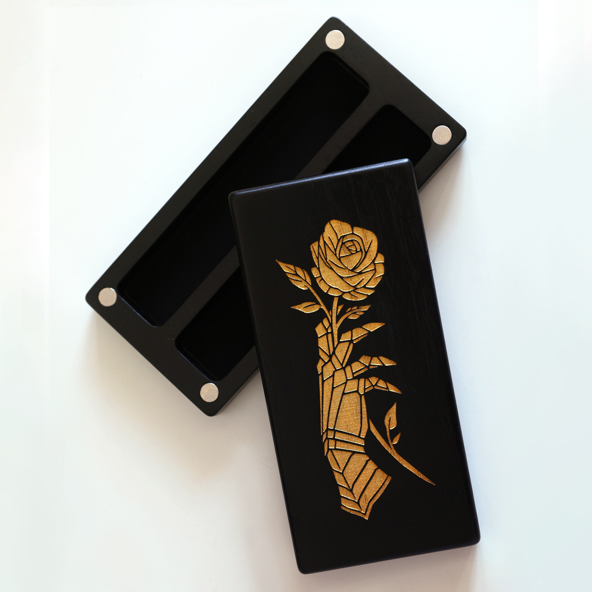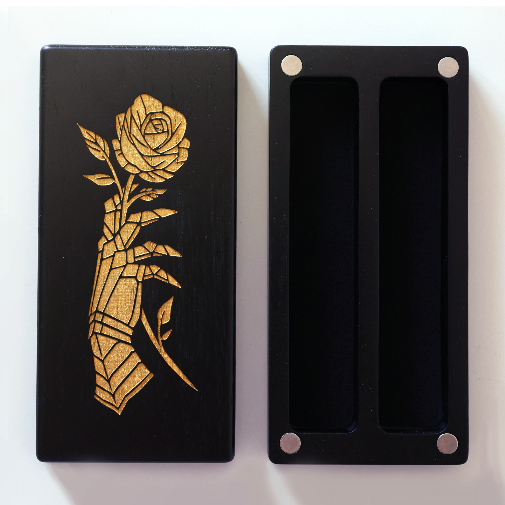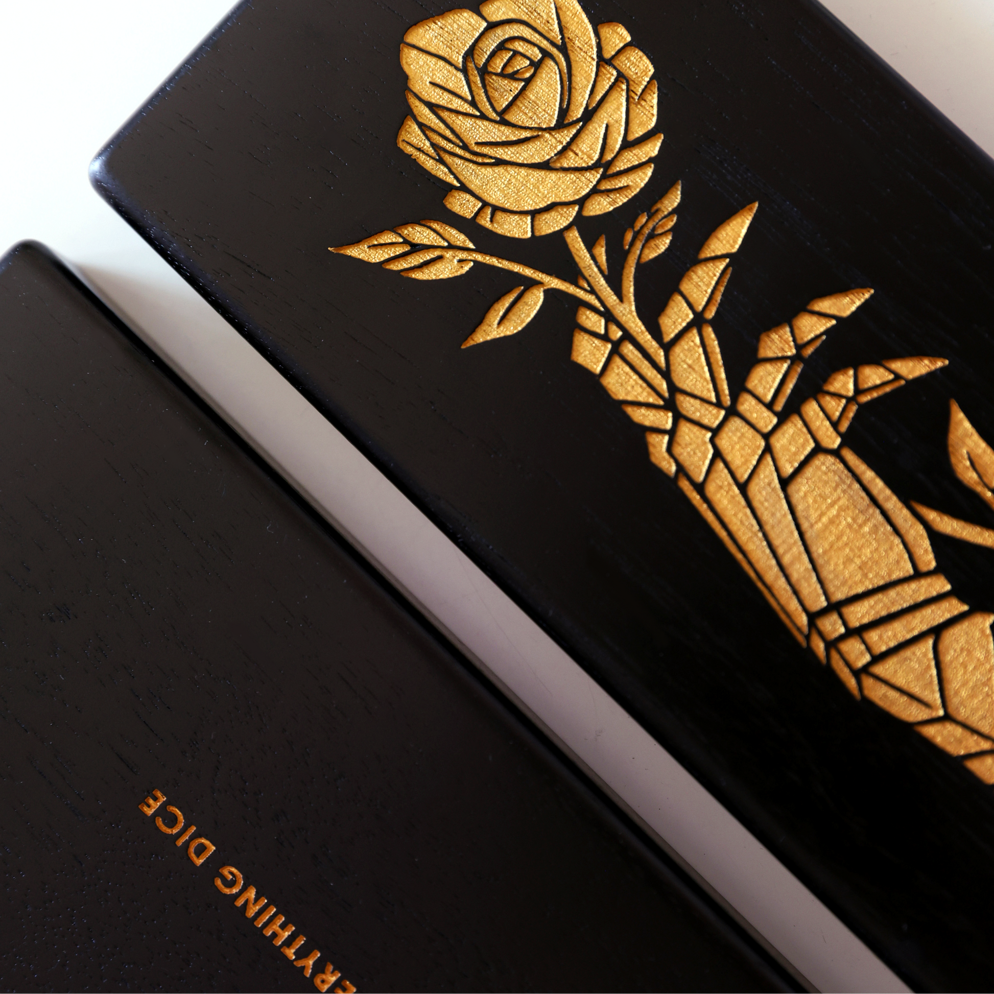 Protect your dice in this elegant vault, featuring etched custom artwork. Our vaults are made out of black walnut wood with magnetic clasps and black velvet lining. All vaults come shipped with a protective velvet bag.